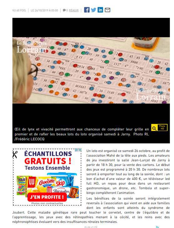 C'est le samedi 26 octobre 2019 à 20h30 qu' a débuté notre 2ème loto à la salle Jean Lurçat de Jarny (54800). Salle comble et succès furent au rdv !