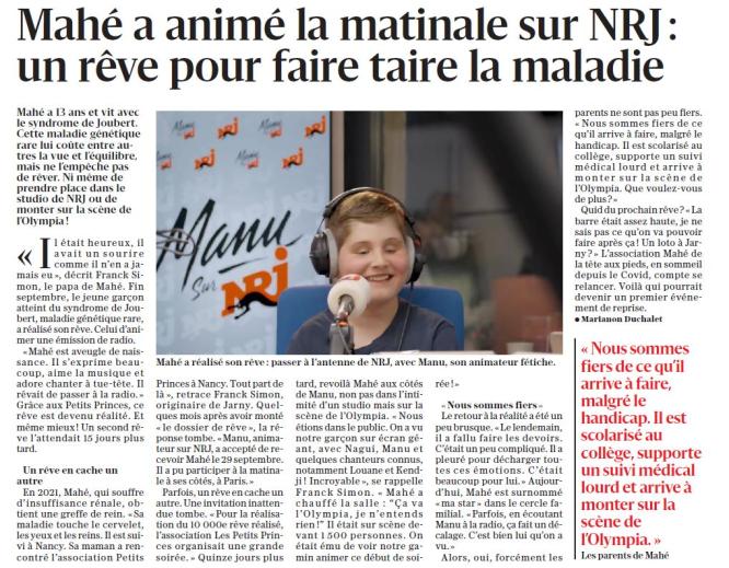 Il a ainsi pu passer une heure en compagnie de Manu et son équipe en direct dans les studios de NRJ à Paris, et co-présenter la soirée évènementielle du 10.000 ème rêve de l'association Petits Princes dans la mythique salle de l'Olympia avec présence de Manu, Nagui, M. Pokora, Kendji, Louane, et d'autres petits princes et princesses... !